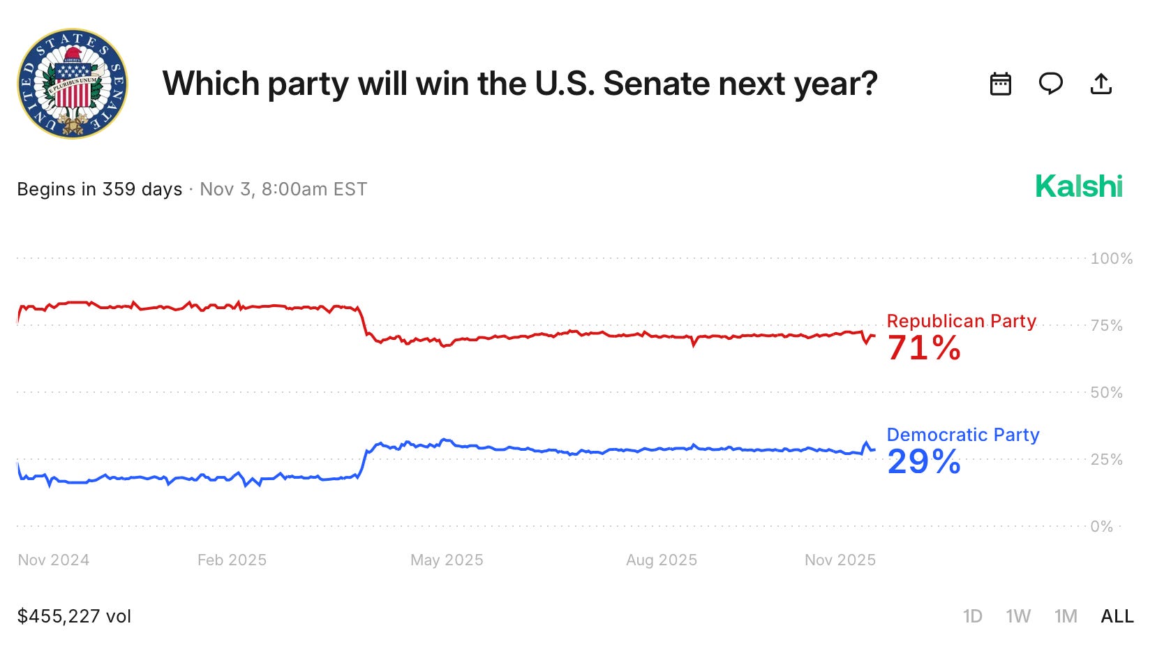 Tuesday’s elections certainly showed that the affordability issue that was there for Democrats in 2024 is still very much there for Republicans in 2025, and likely will be the top issue in 2026. However, the dynamics simply favor Republican Senators at the moment, which could be why an 80-20 belief from earlier this year in the prediction markets is still a solid 70-30 now.