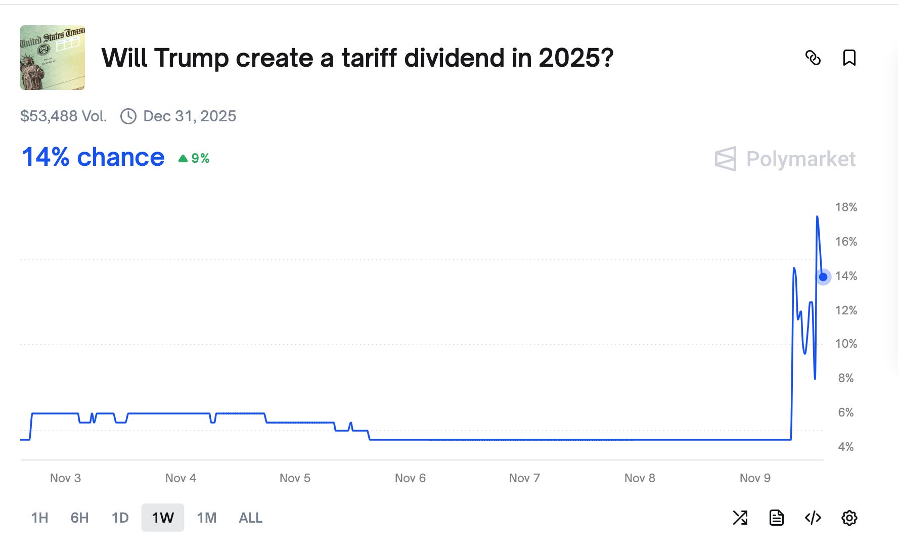 There’s a small market right now around this concept, but the yes/no contracts are a heavy no at this point when it comes to a dividend taking shape this year. After all, the government is currently shut down.