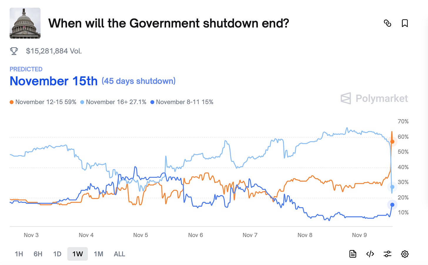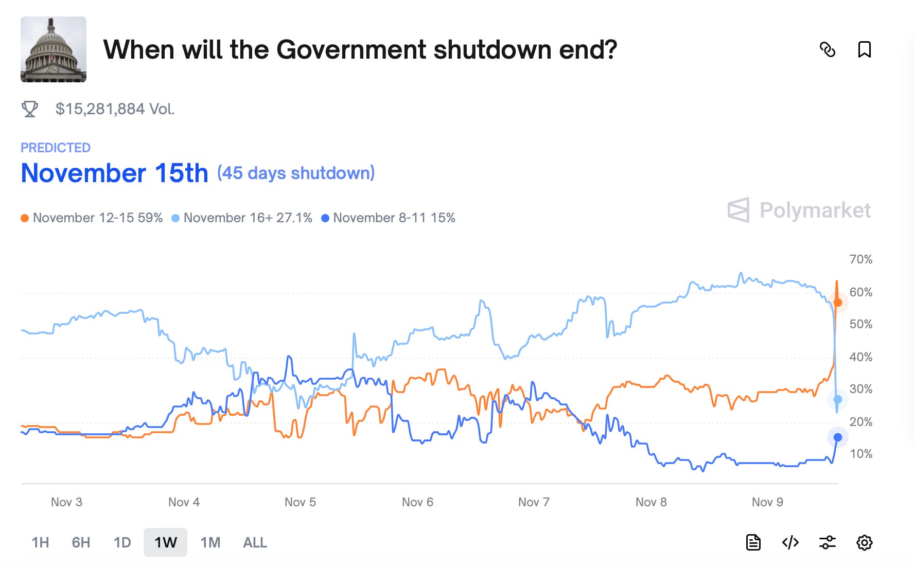 Now it seems like we are on the air travel hurdle, as flights are being cancelled and delayed all over the place. Still, the shutdown continues. Prediction markets still believe this ends right around day 45, which would be the end of this week.