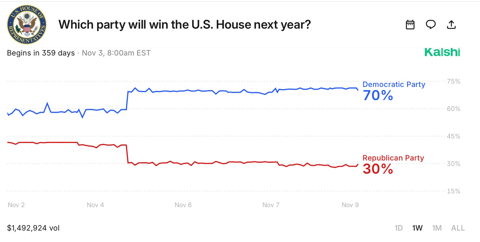 The Senate is basically a 70-30 in the prediction markets also, but in favor of Republicans. They do have to defend more seats than Democrats in ‘26, but Republicans currently hold 53 seats.